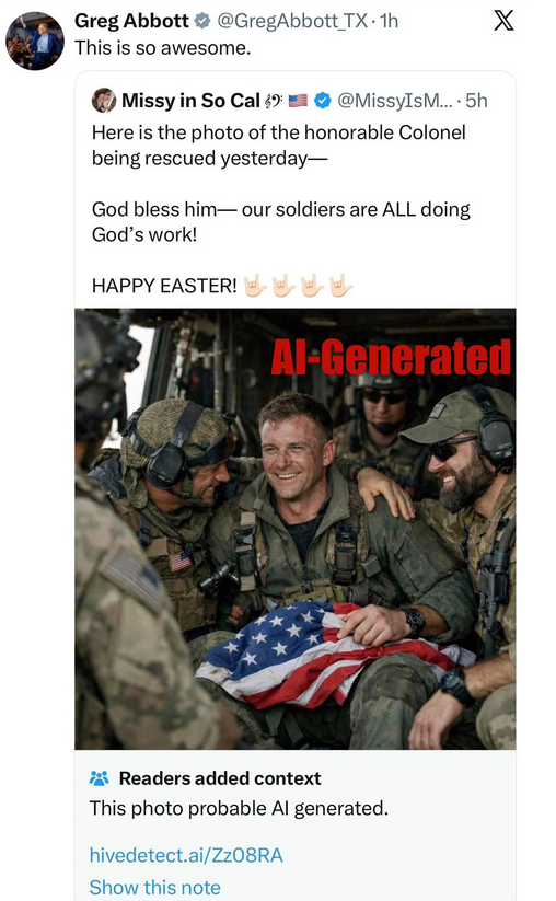 While reposting Abbott’s error, Reason magazine reporter Billy Binion wrote: “This kind of stuff is bleak. I get that we’re in a new era, but we desperately need a new crash course in media literacy, or just a reminder to be remotely discerning. The governor of Texas should not be sharing an obviously fake photo from a slop account.”